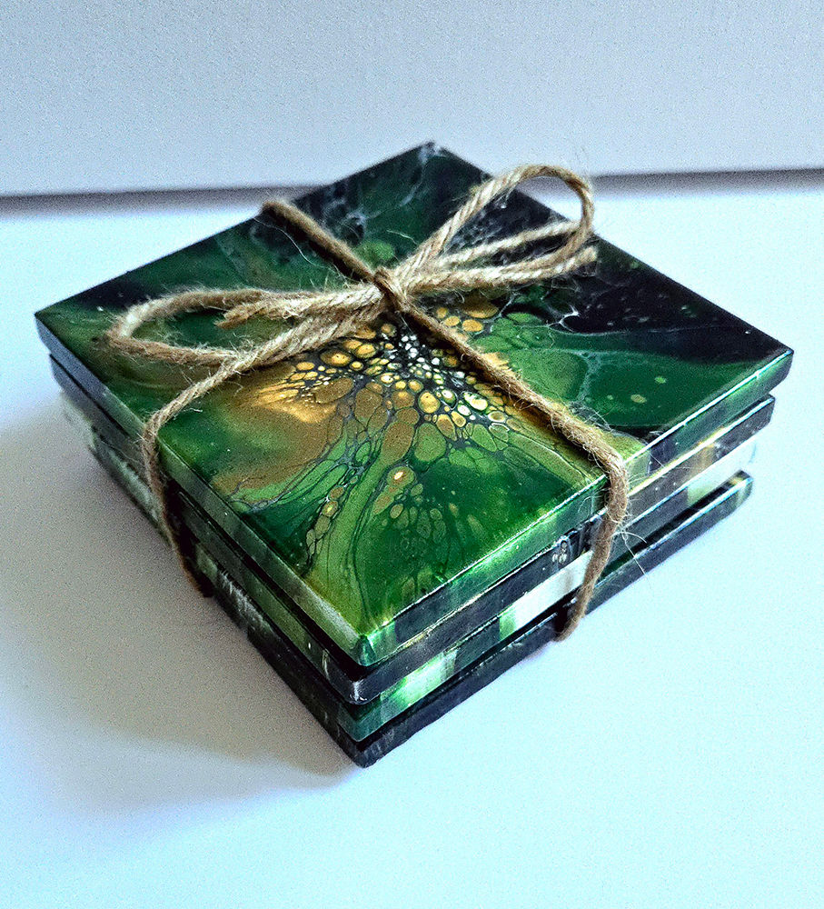 These are sets of (4) 4"x4" coasters. Each coaster is hand painted in acrylic paint, so no coaster is exactly the same. This makes each coaster a unique one of a kind piece of art. They are hand signed in the back of each coaster.